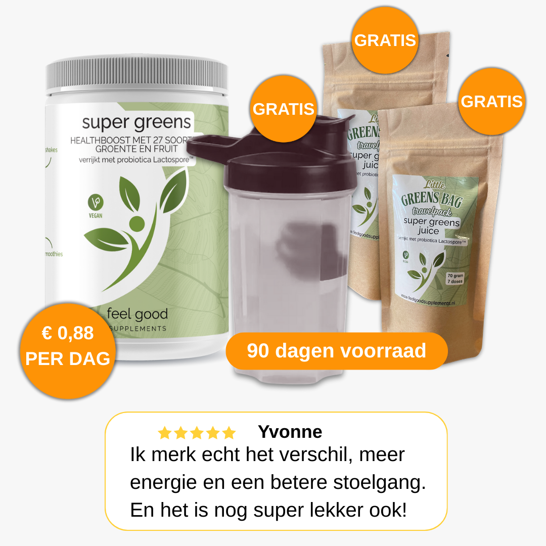 We willen dat je met vertrouwen bestelt, zonder risico. Je hebt 90 dagen de tijd om Super Greens Juice uit te proberen. Ben je niet tevreden? Dan kun je je resterende ongeopende travelpacks of potten binnen deze periode gewoon retourneren. Wij adviseren daarom met de travelpacks te starten. Na ontvangst van je retour zorgen we voor een snelle financiele afhandling.